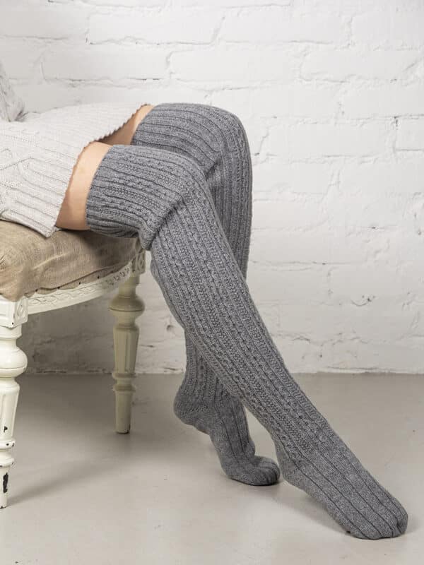 Pitkät villasukat, jotka tulevat yli polven. Sukissa on kaunista koristekirjailua ja joustava, resorimainen yläosa, jonka ansiosta sukat pysyvät ylhäällä. Ihanat over-knee villasukat, jotka näyttävät tyylikkäiltä ja tuntuvat pehmeiltä.