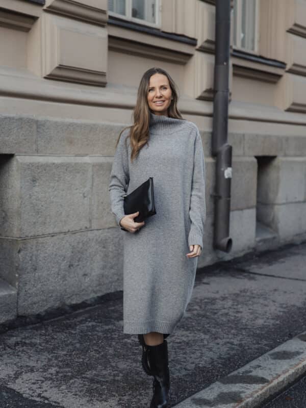 Tyylikäs midimittainen neulemekko, jossa on väljä ja korkea poolokaulus. Kauluksen voi halutessaan myös taittaa. Resorit hihoissa ja helmassa. Kuvassa mekko on hieman vaaleampi kuin luonnonvalossa.