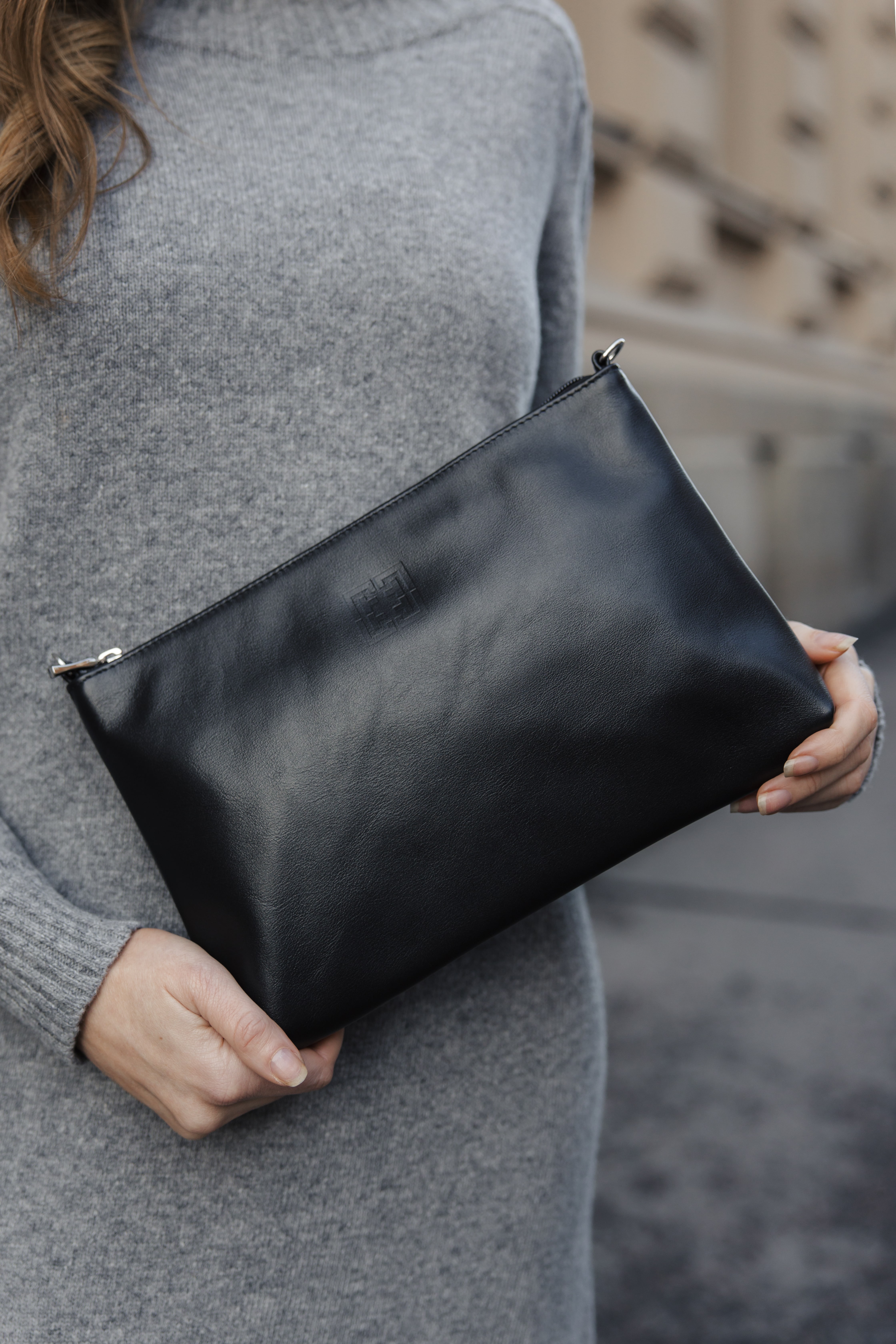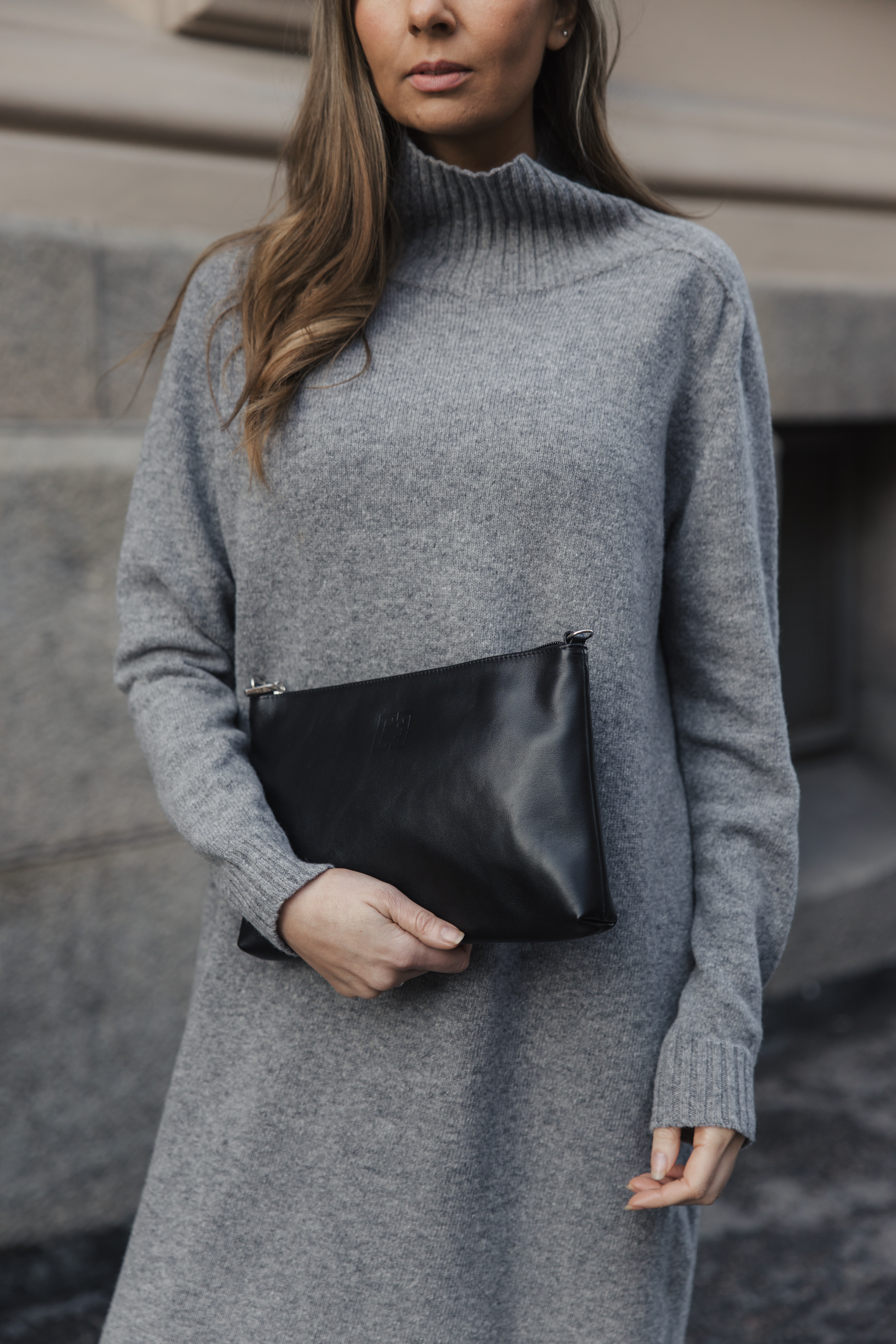 Tämä nahkainen laukku irrotettavalla olkahihnalla sopii hyvin arkeen ja juhlaan. Laukkuun on ulkopuolelle painettu PURA FINLAND logon monogrammi.