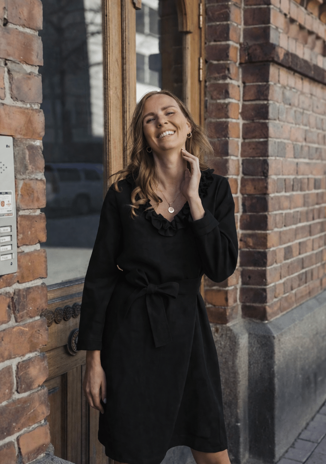 Kaunis kerrostettu levenevähelmainen mekko, jossa on V-pääntie ja kaulukset. Pussimaiset 3/4 hihat. Mekko on valmistettu Tampereella laadukkaasta sileäpintaisesta ja ryhdikkäästä puuvillasekoitteesta.