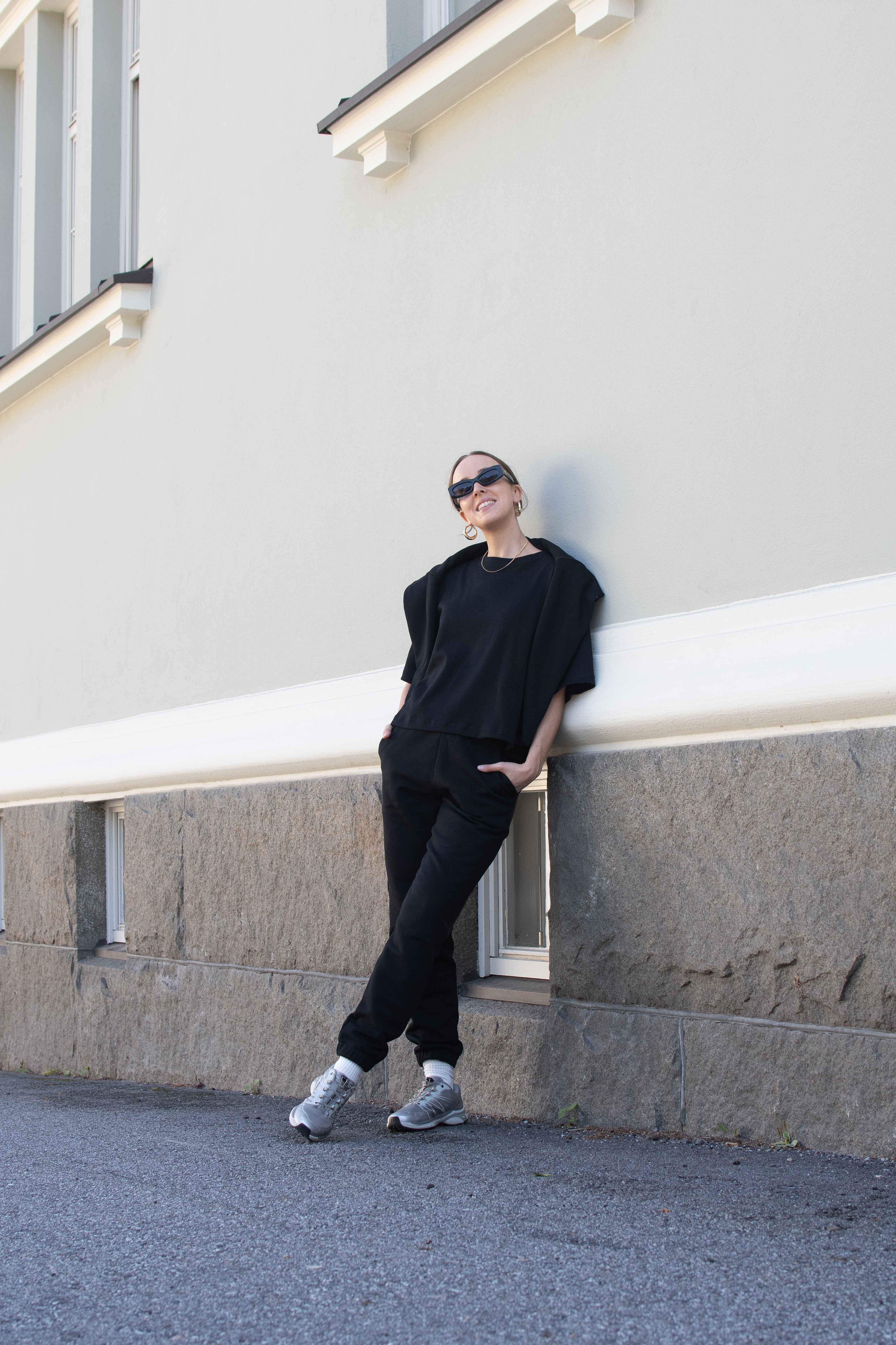 Laadukkaat collegehousut, jotka on valmistettu paksusta luomupuuvillasta ja kierrätetystä polyesteristä. Housuissa on pehmeäksi harjattu sisäpinta, korkea vyötärö ja kapeat lahkeet resoreilla. Sivutaskujen lisäksi housuissa on takatasku.