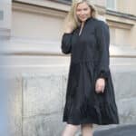 Pitkähihainen mekko, jonka materiaali on sileää ja mukavan joustavaa puuvillasekoitetta. Pääntiessä on kapea V-halkio. Mekossa on pussimaiset hihat ja kerrostettu leveä helma.