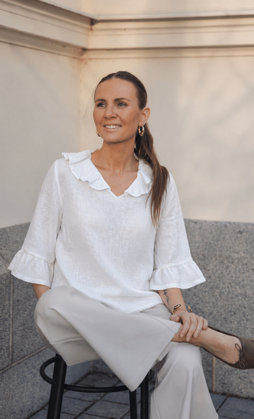 LINEN Ruffle Shirt -pellavapusero on valmistettu laadukkaasta 100 % pellavasta. Koristerypytys edessä. Klassinen pellavapaita, joka on takaa hieman pidempi kuin edestä.