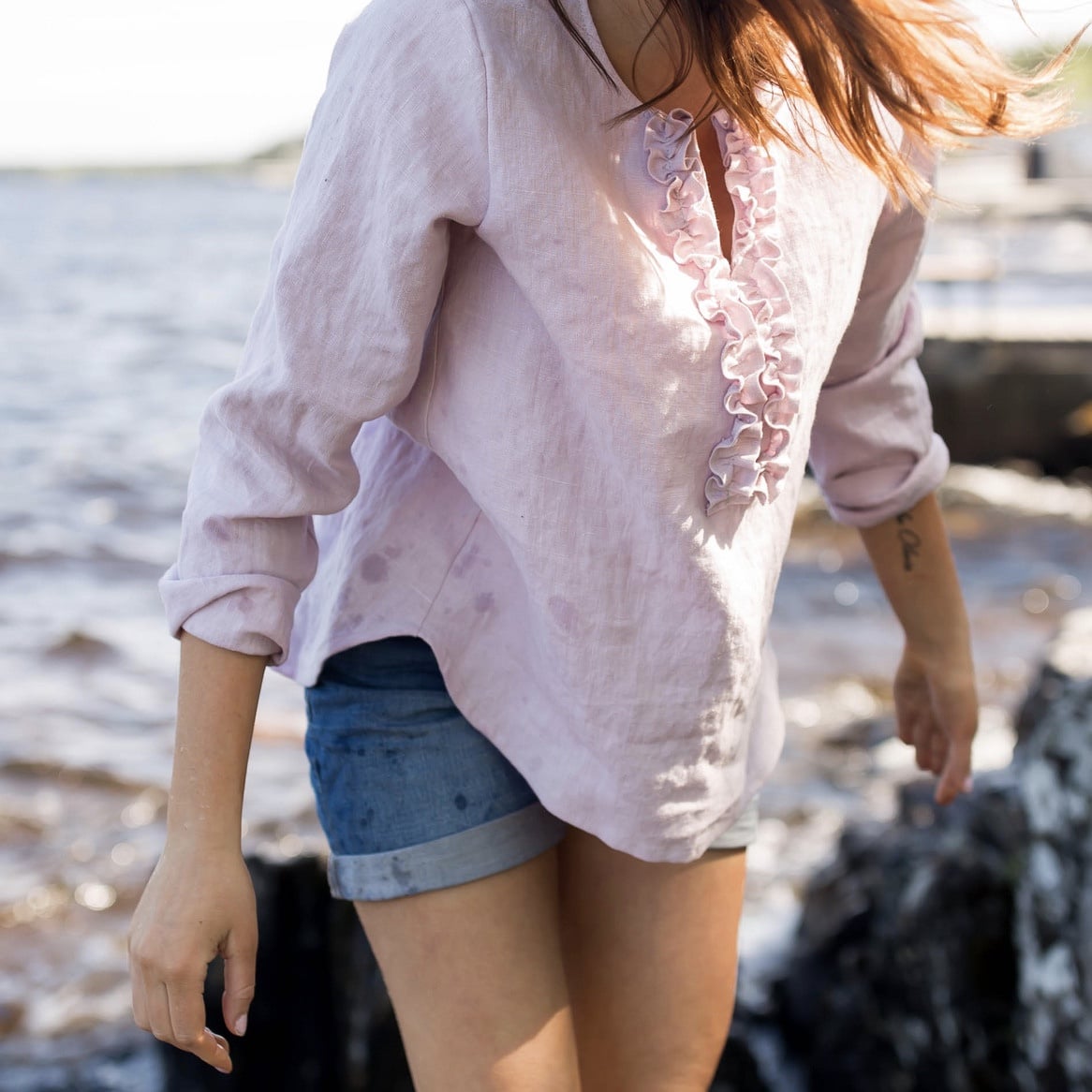 LINEN Ruffle Shirt -pellavapusero on valmistettu laadukkaasta 100 % pellavasta. Koristerypytys edessä. Klassinen pellavapaita, joka on takaa hieman pidempi kuin edestä.