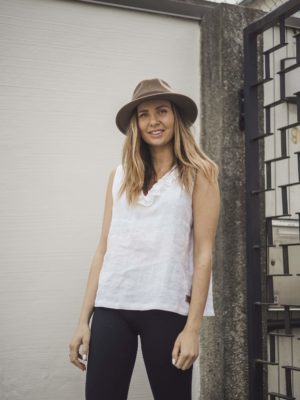 Hihaton pusero, joka on valmistettu laadukkaasta 100 % pellavasta. Puserossa on V-pääntie, jossa on kaunis koristerypytys.