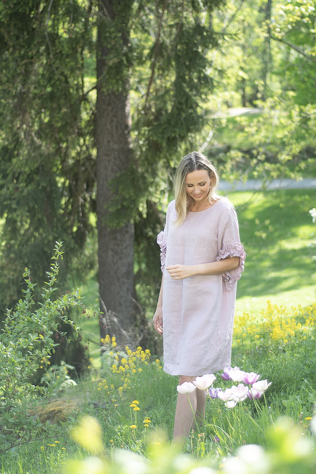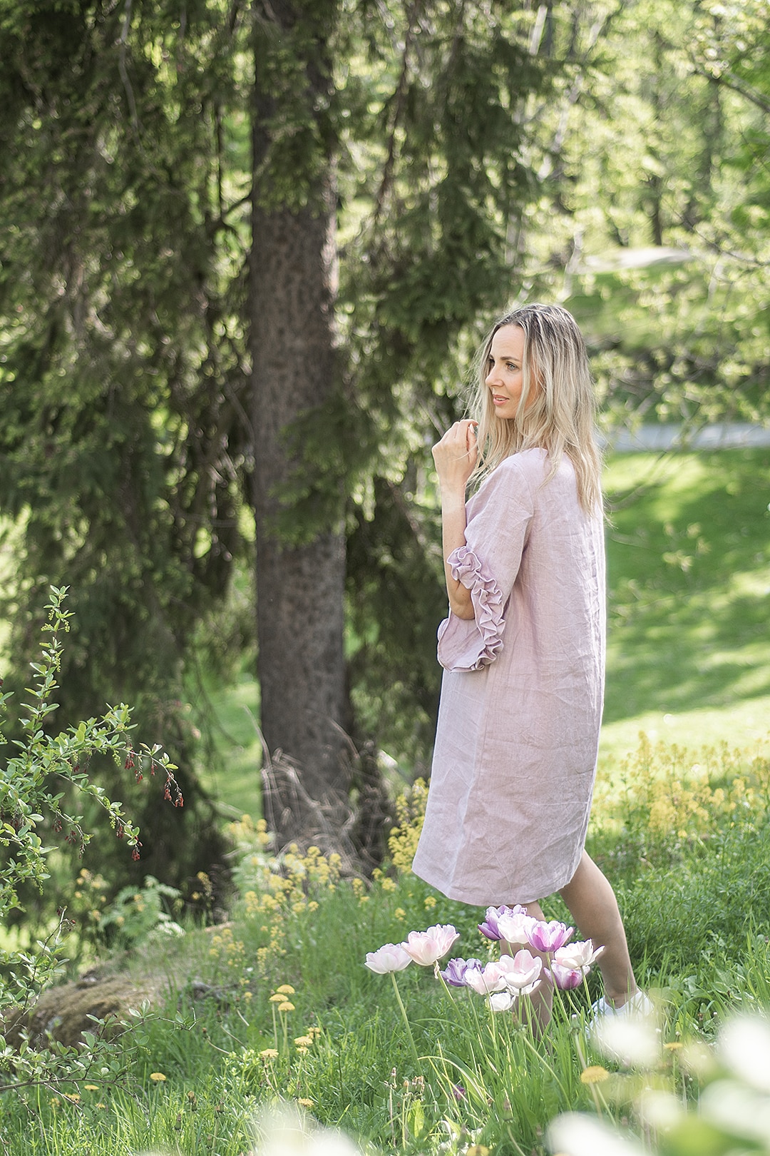 Kaunis ja näyttävä pellavamekko, jossa on koristeelliset levenevät hihat. Loivasti A-linjainen malli ja pyöreä pääntie.