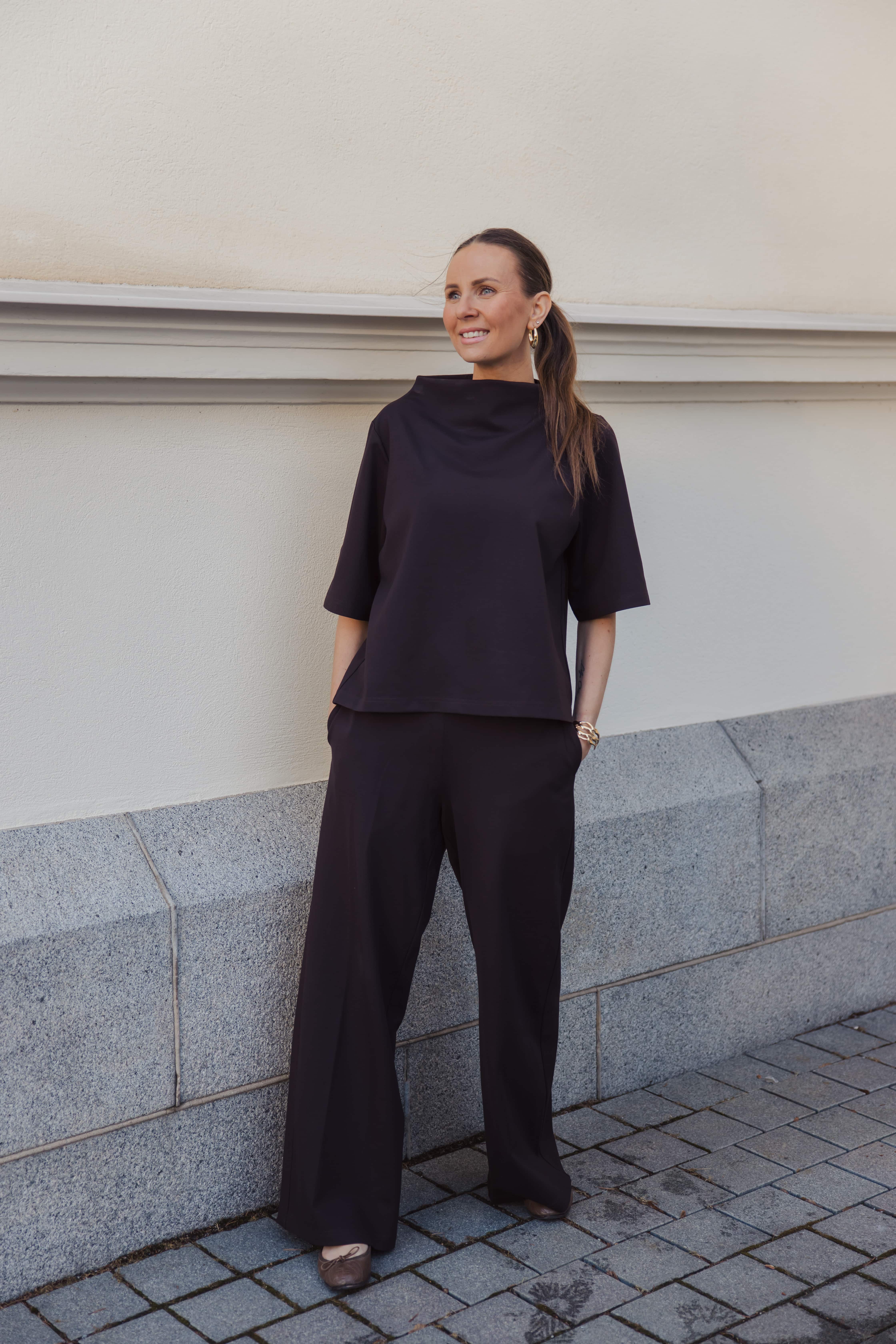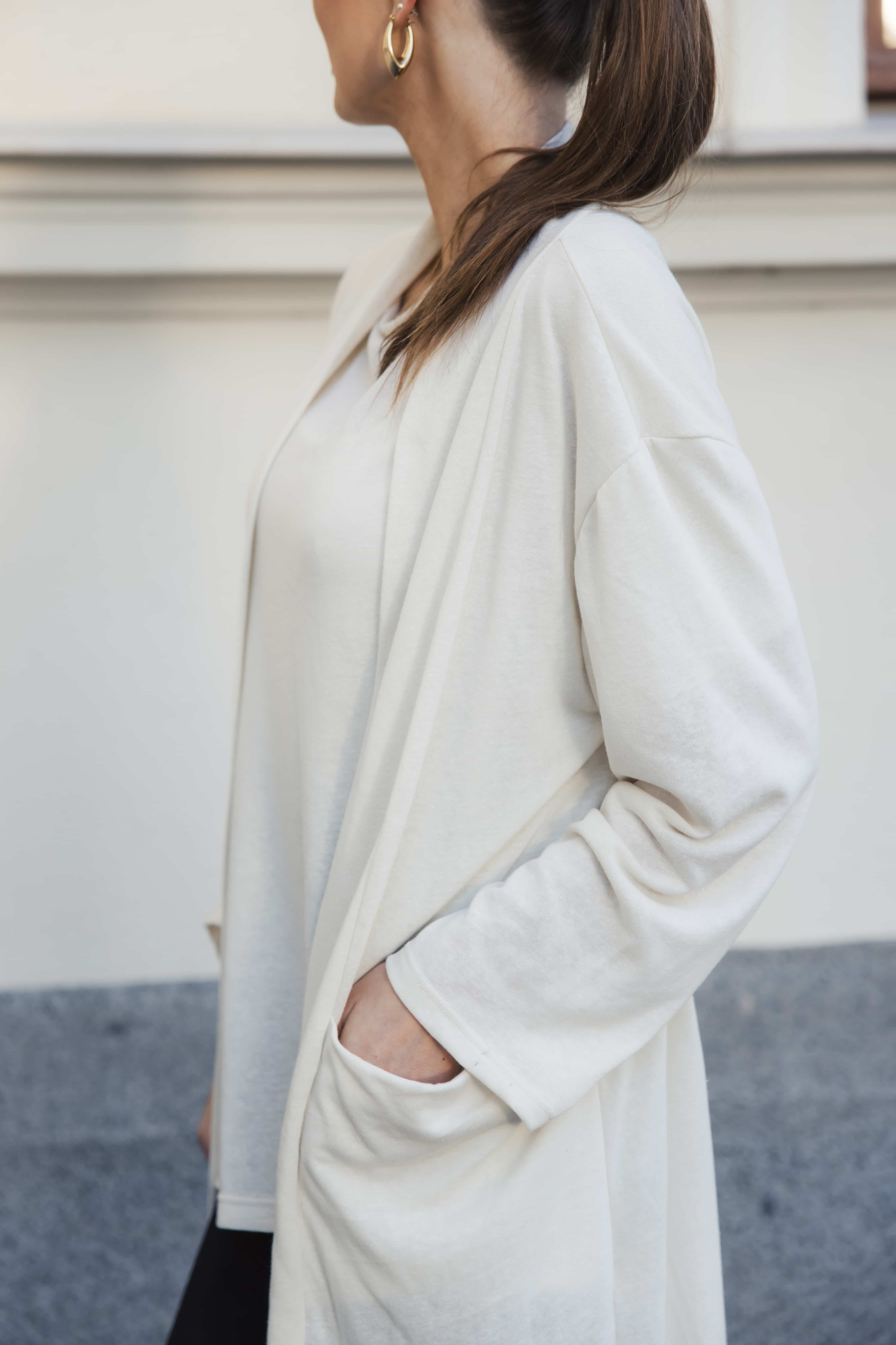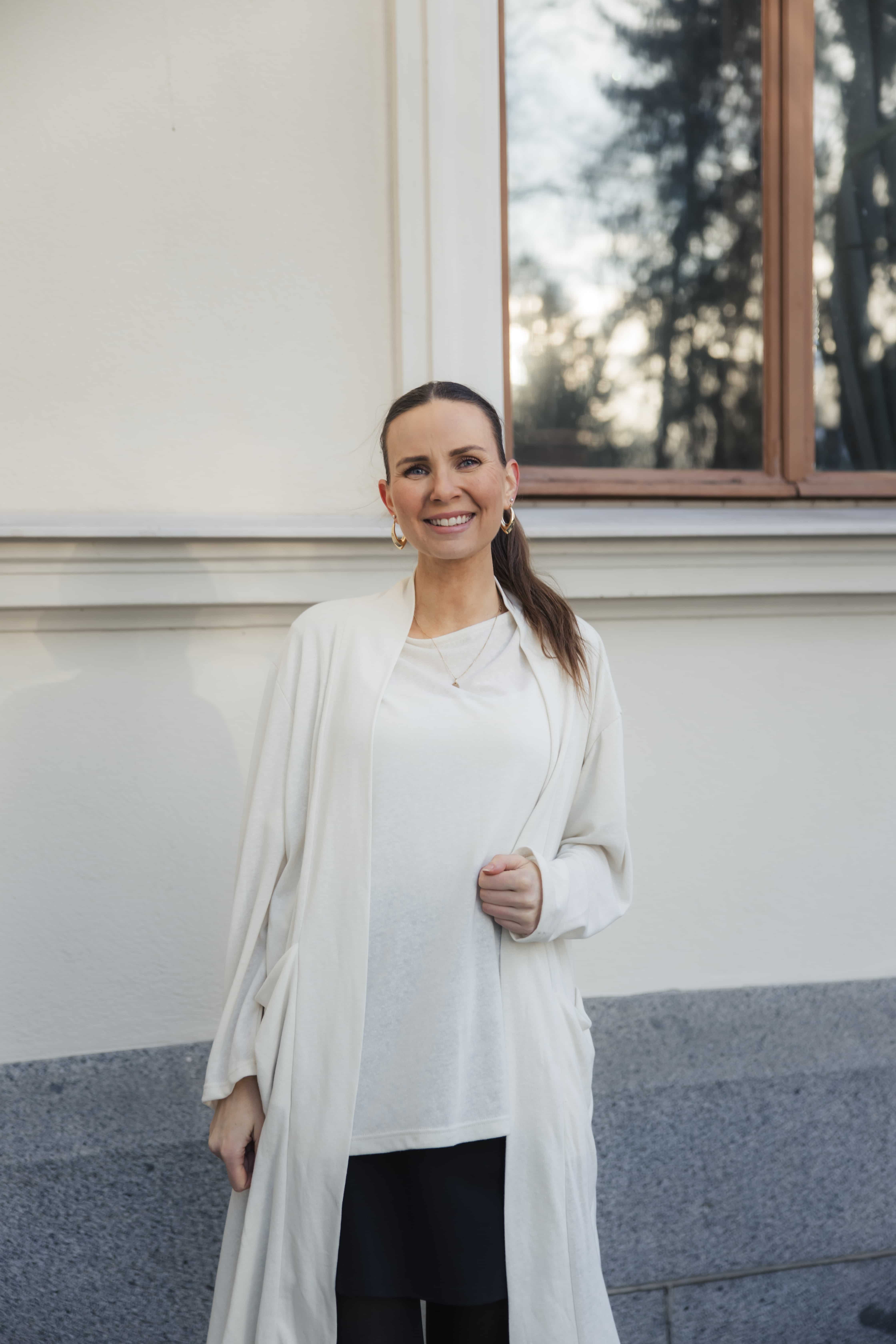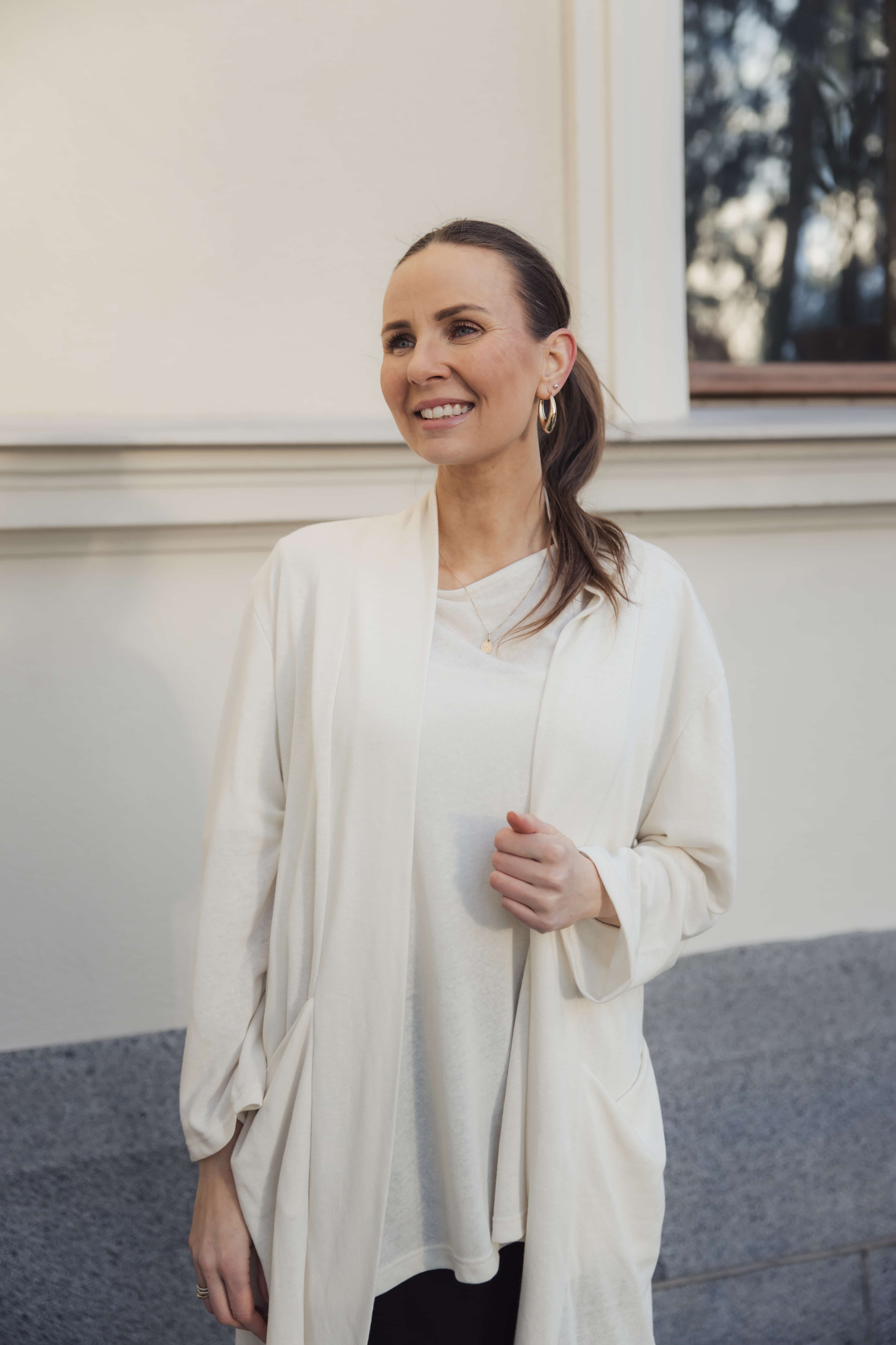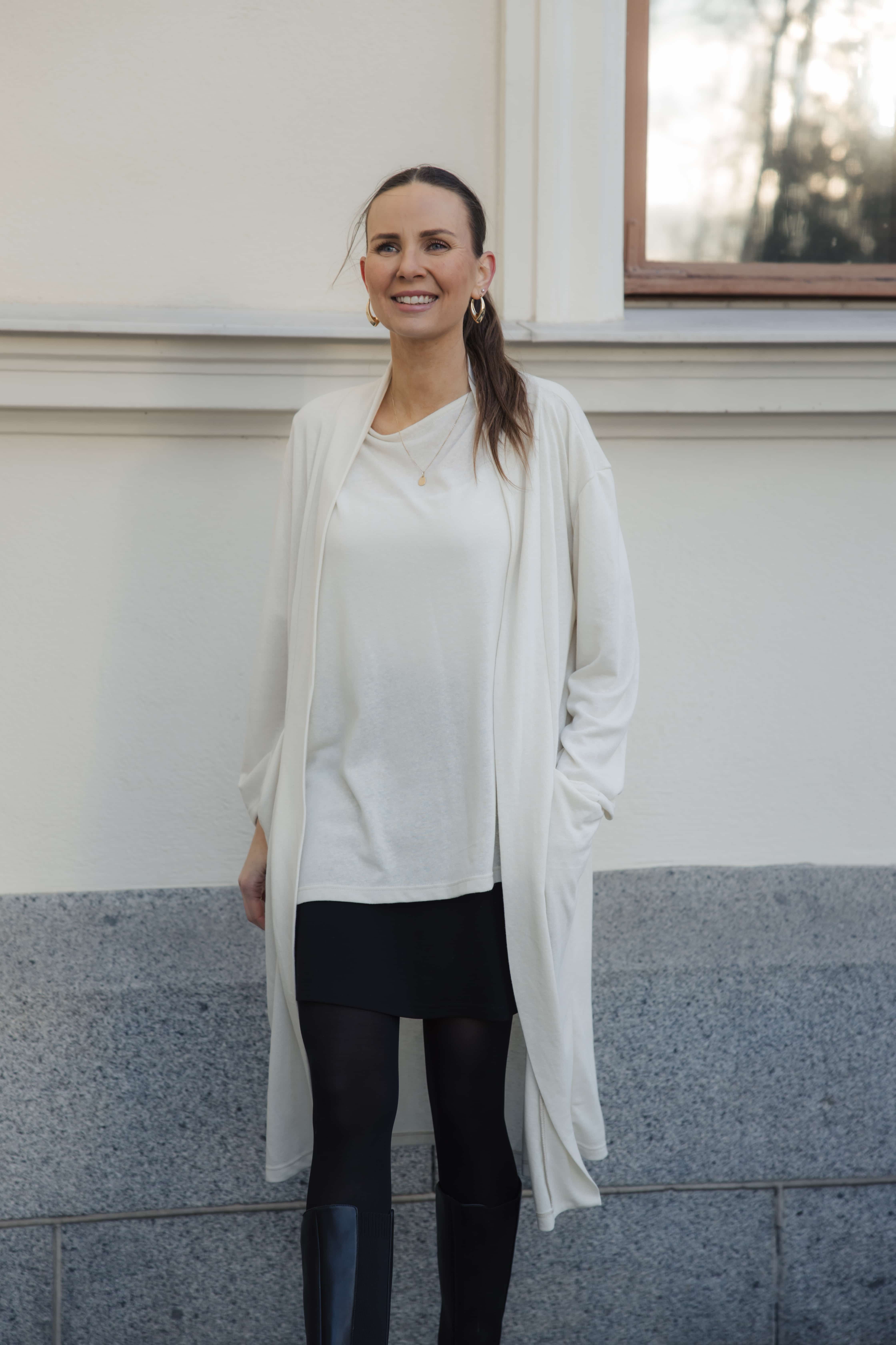 Pitkä neuletakki, joka on valmistettu varastomme ylijäämä kankaasta. Rennossa neuletakissa on avoin malli ja etutaskut. Settiin kuuluu myös T-paita.