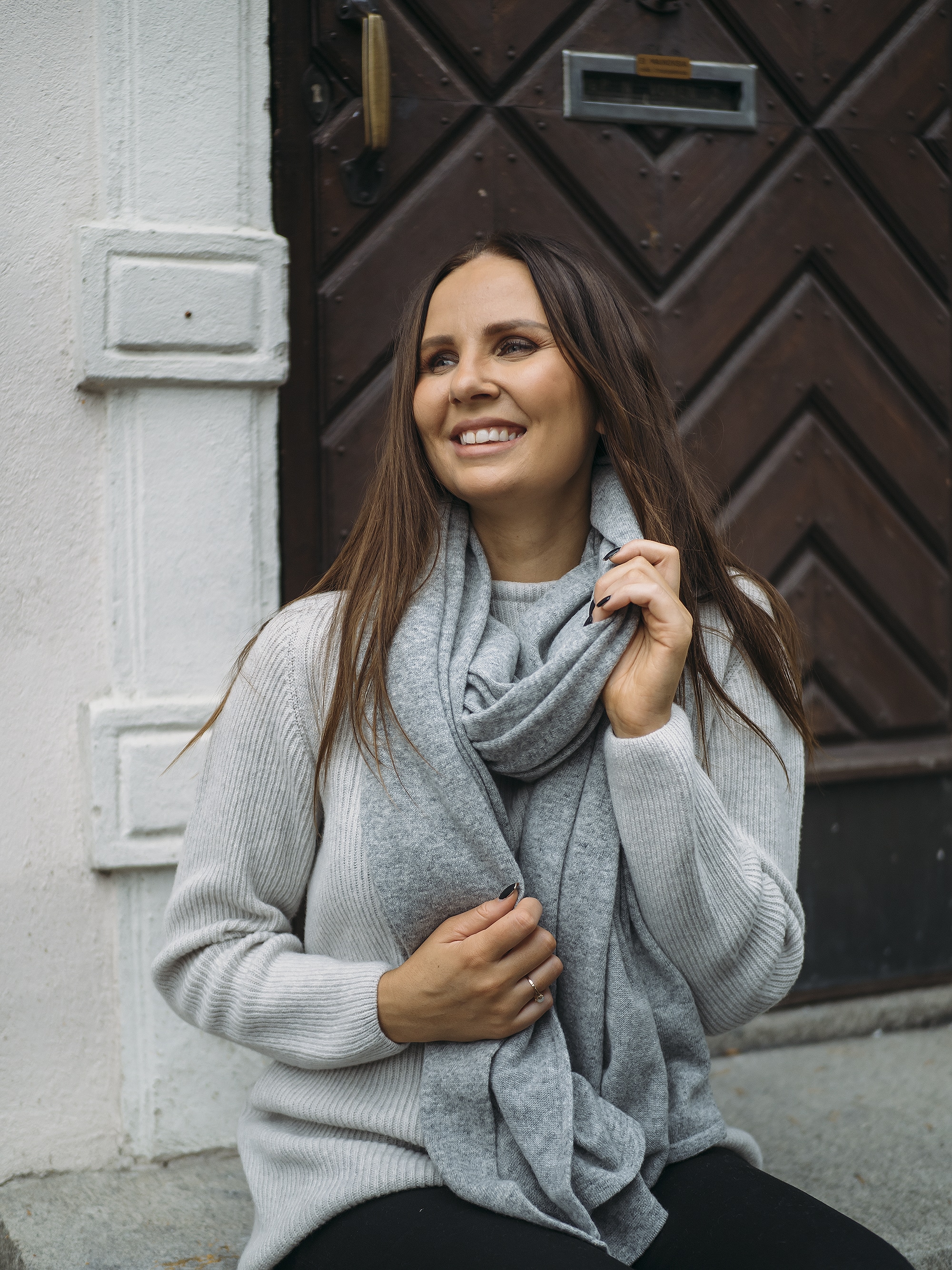 PURAn ihanan pehmeä kaulaliina 100 % villaa. Iso ja muhkea kaulahuivi, joka lämmittää kylmimpinäkin päivinä. Huivissa on laadukas ja tiheä neulos. Alareunassa pieni PURA-logo.