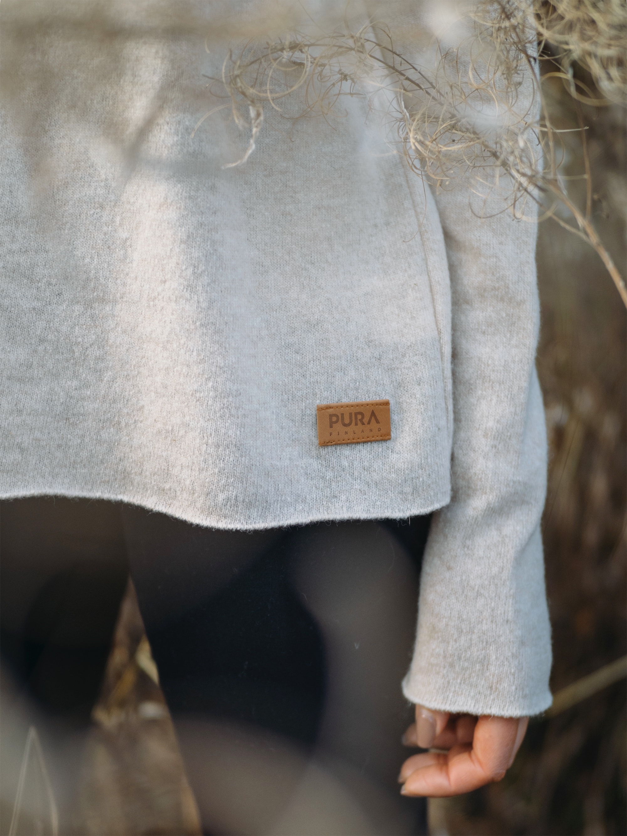 Klassinen neule pehmeää 100 % villaa. Villapaidassa on rento istuvuus sekä kauniisti kapenevat hihat ja rullaantuva helma. Venepääntie. Neuleessa on väljä, laatikkomainen malli, joka laskeutuu kauniisti. Pudotettu olkalinja ja helmassa PURA-logo.