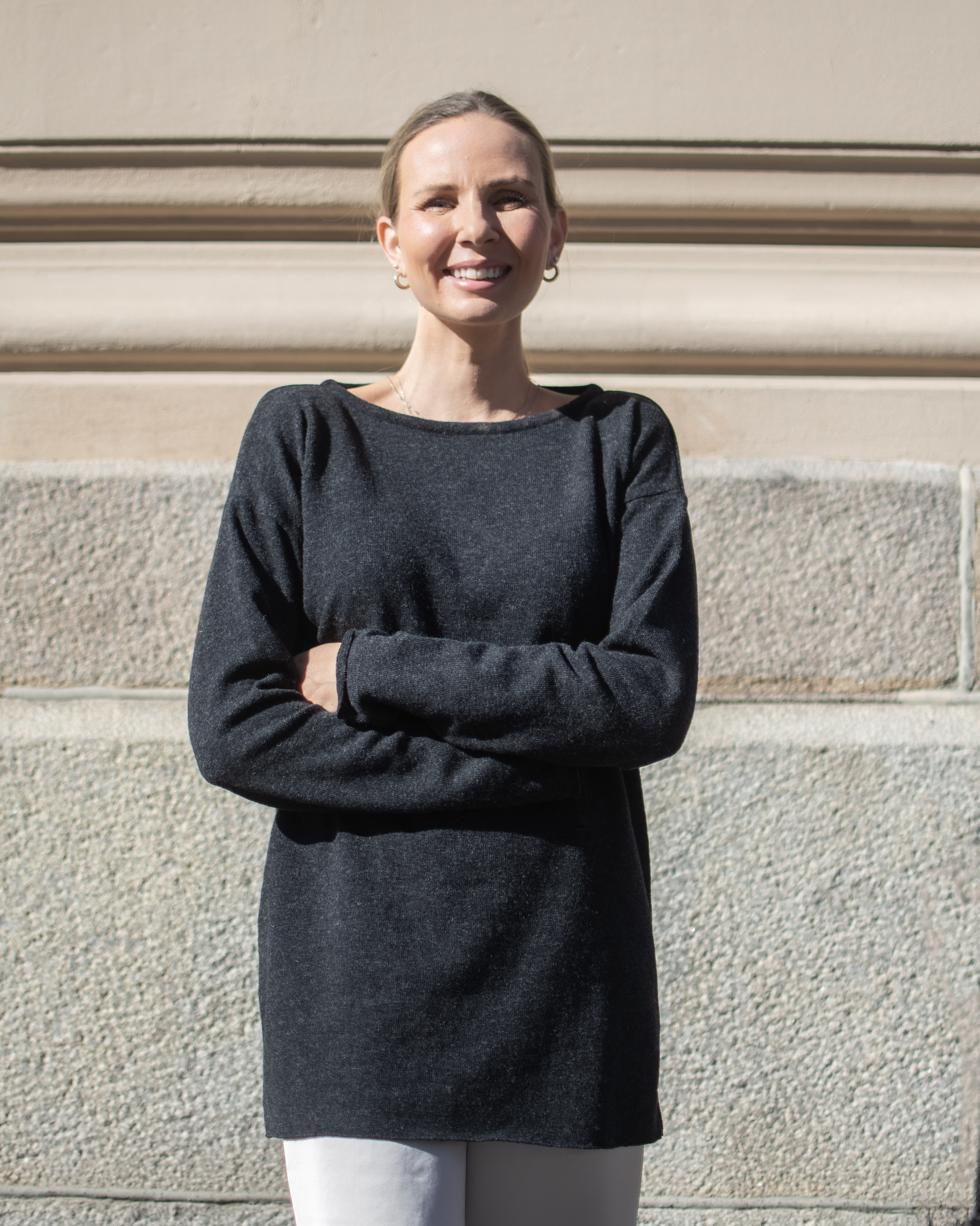 Laadukas neulepusero, jossa suorat hihat ja pyöreä pääntie. Helma rullautuu kauniisti. Neuleessa on oversize-mitoitus. HUOM. kuvasta poiketen helmassa ei ole ulkopuolella logoa.