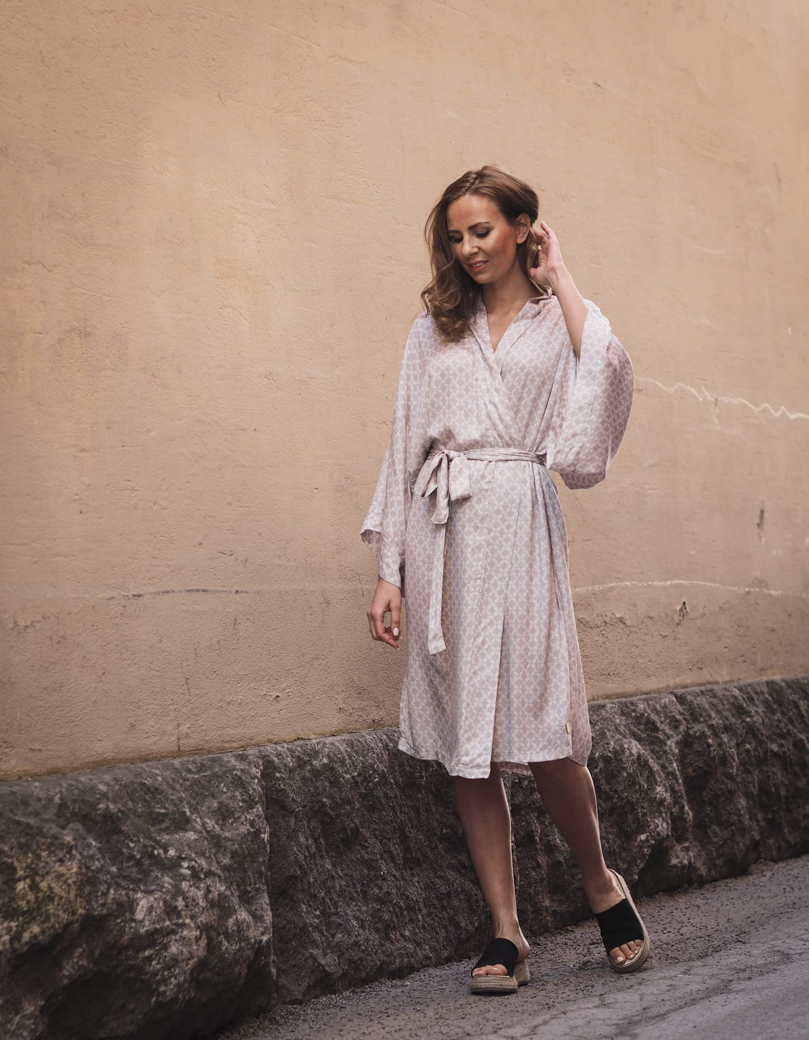 Ylellinen kietaisumallinen kimono, jota voi käyttää niin aamutakkina kuin mekkona. Pitkät leveät hihat ja irrotettava vyö. Monogrammikuvioidussa kankaassa on kaunis himmeä kiilto, ja materiaali tuntuu silkkisen pehmeältä.