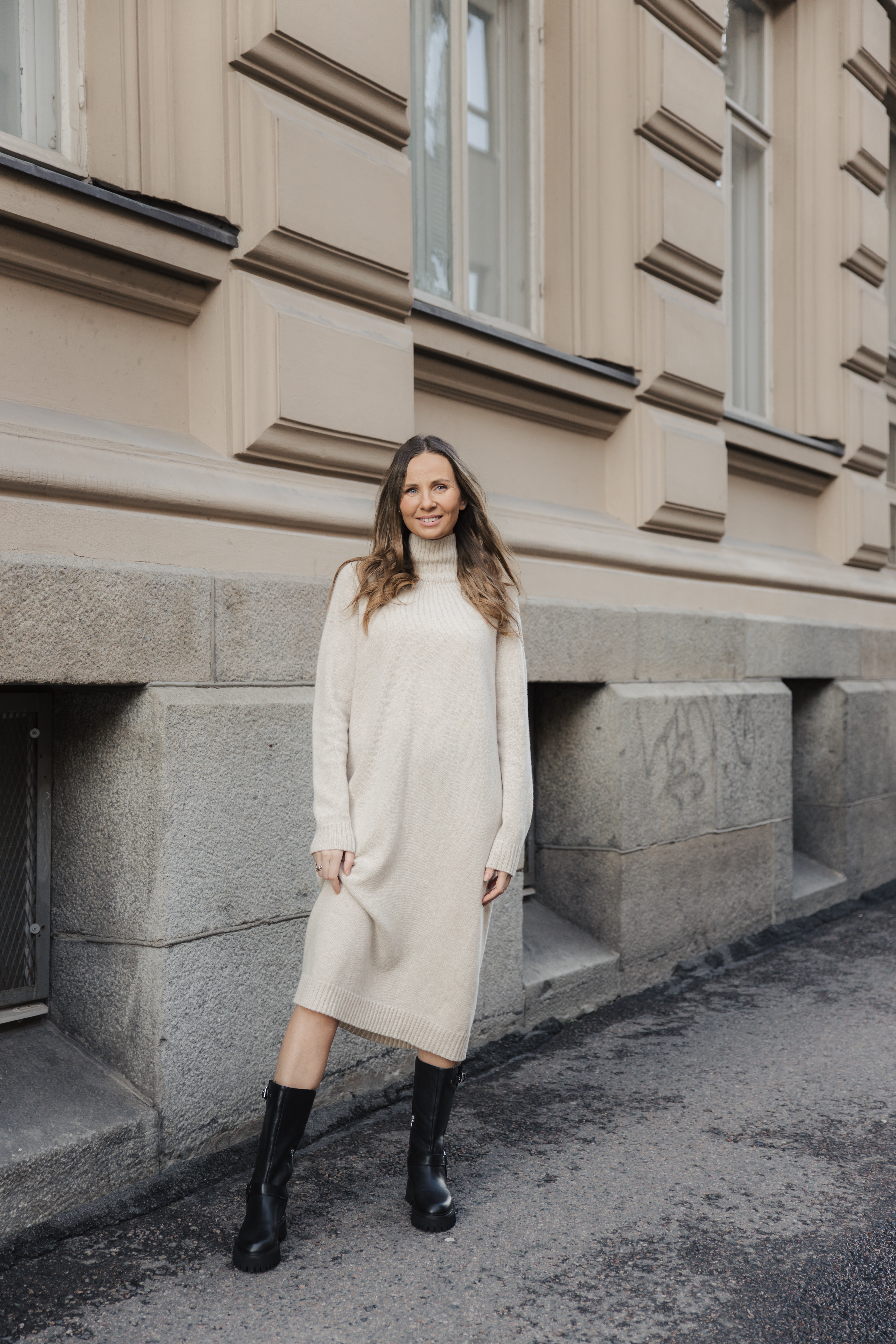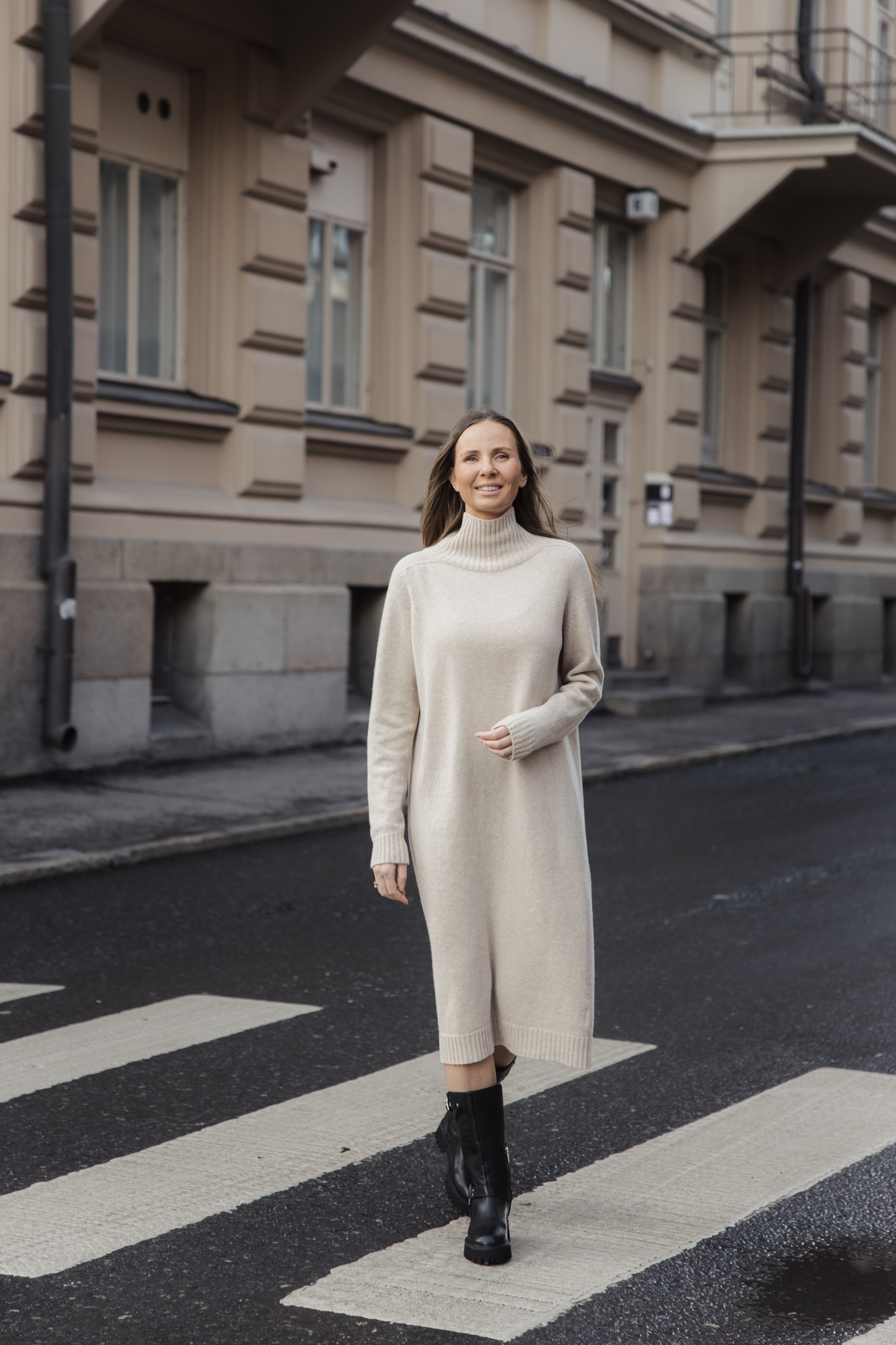 Tyylikäs midimittainen neulemekko, jossa on väljä ja korkea poolokaulus. Kauluksen voi halutessaan myös taittaa. Resorit hihoissa ja helmassa. Pitkässä neuleessa on oversize-mitoitus.