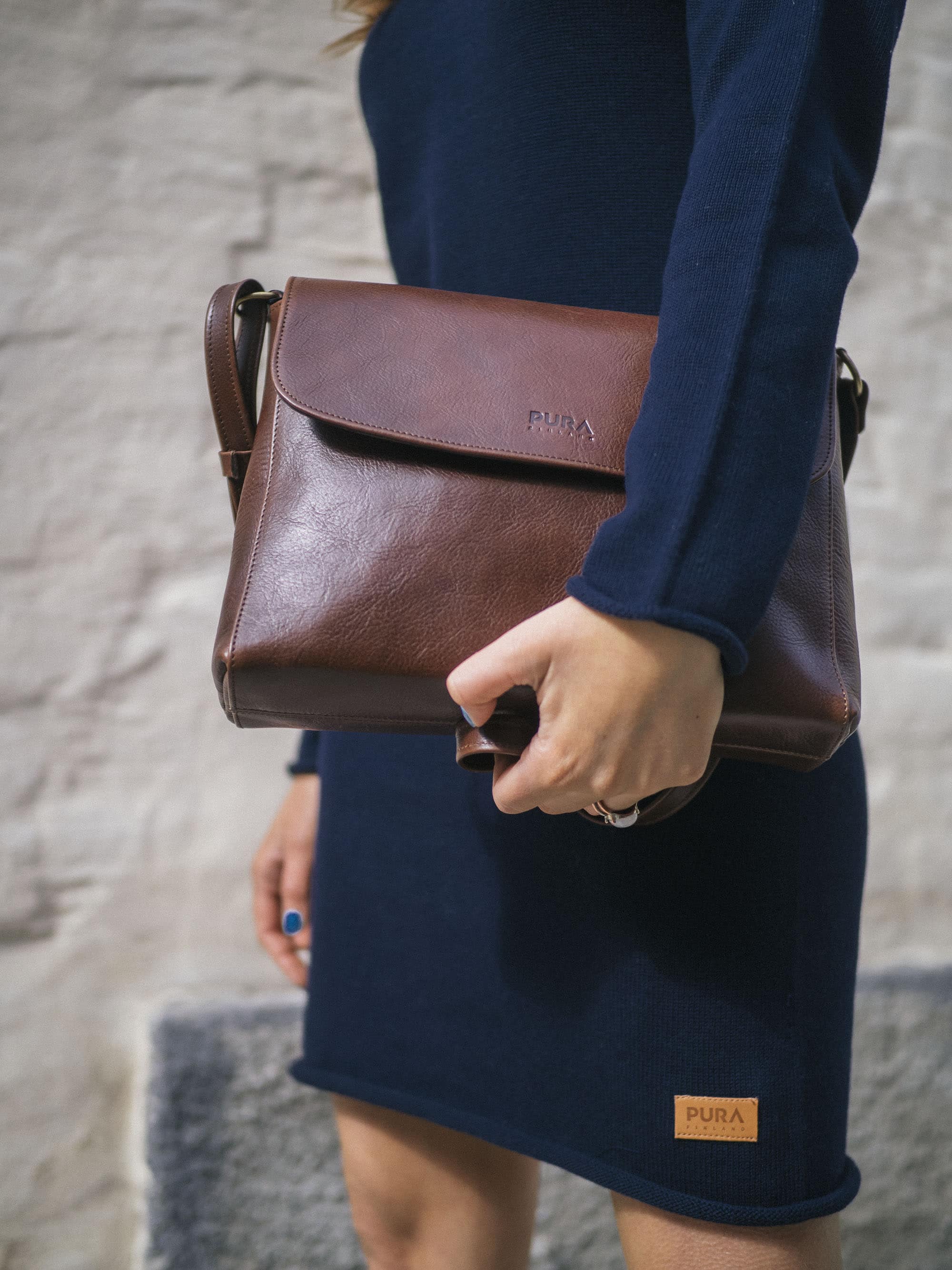 Suomessa valmistettu nahkainen olkalaukku. Tyylikäs ja minimalistinen laukku, joka on sisältä jaettu kahteen osioon kätevän väliseinän avulla. Laukussa on pitkä ja säädettävä olkahihna ja magneettikiinnitys. Laukun ulkopuolella on vetoketjullinen takatasku.  Sisällä on kaksi vetoketjullista taskua ja yksi pieni avoin tasku esimerkiki pankkikortille. Kangasvuori. Kullanväriset metalliosat. Nahkaan painettu PURA-logo laukun etuosassa.