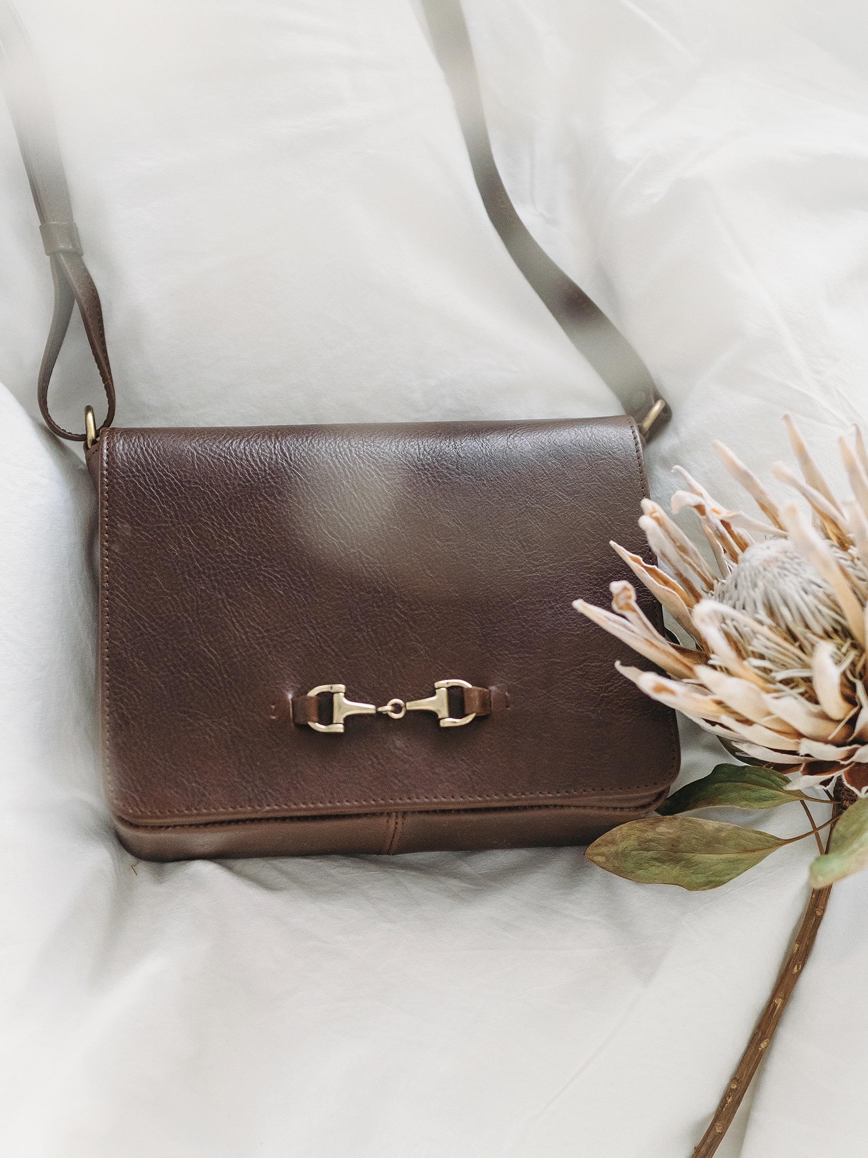Suomessa valmistettu nahkainen olkalaukku. Tyylikäs ja minimalistinen laukku, joka on sisältä jaettu kahteen osioon kätevän väliseinän avulla. Laukussa on pitkä ja säädettävä olkahihna ja magneettikiinnitys. Laukun ulkopuolella on vetoketjullinen takatasku. Sisällä on kaksi vetoketjullista taskua ja yksi pieni avoin tasku esimerkiki pankkikortille. Kangasvuori. Kullanväriset metalliosat. Nahkaan painettu PURA-logo laukun etuosassa.