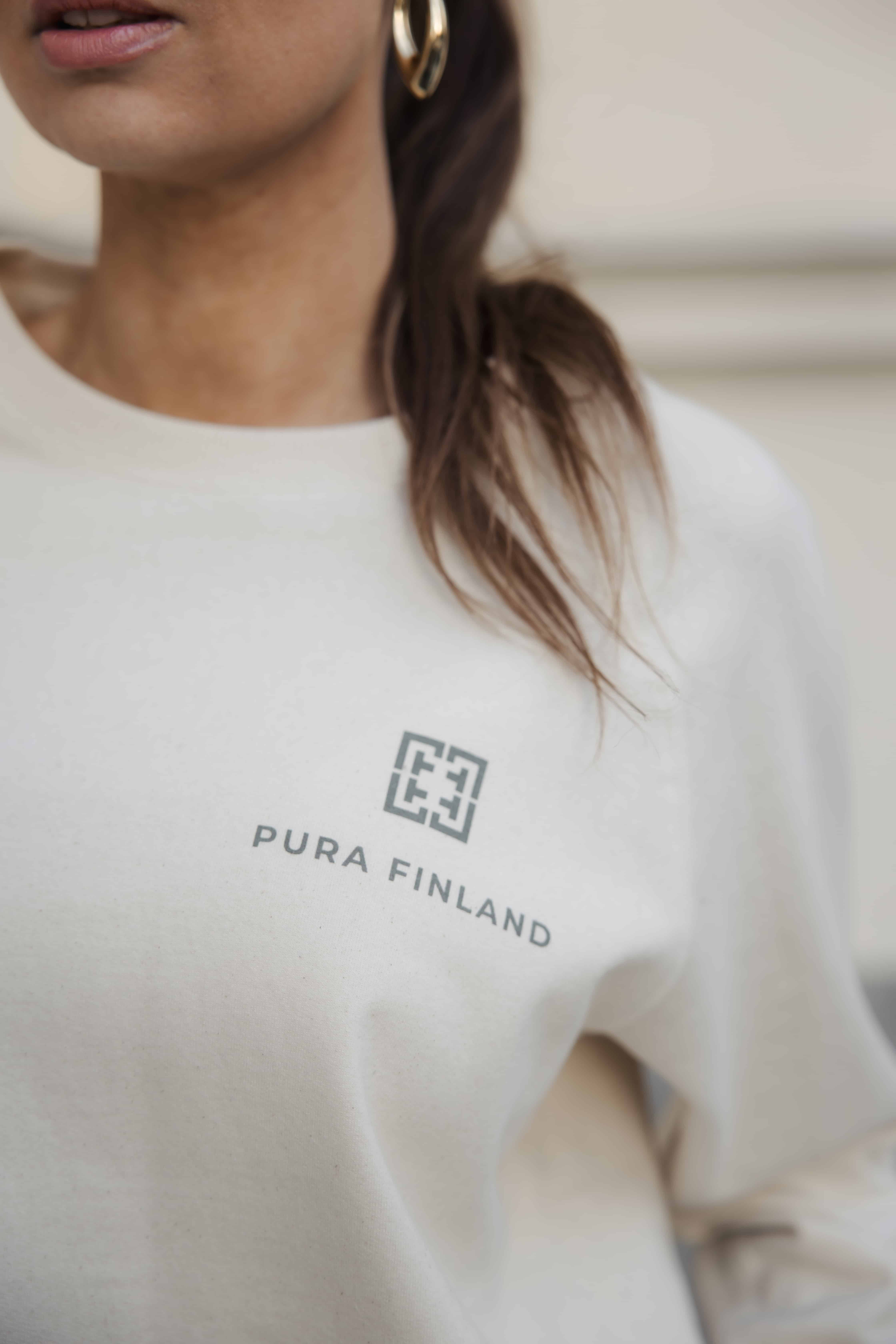 NEW PURA UNISEX Sweatshirt on valmistettu yhteistyössä kotimaisen Pure Waste Textilesin kanssa kierrätetyistä raaka-aineista. Oikella painettuna uudistettu PURA logo oliivin sävyssä.